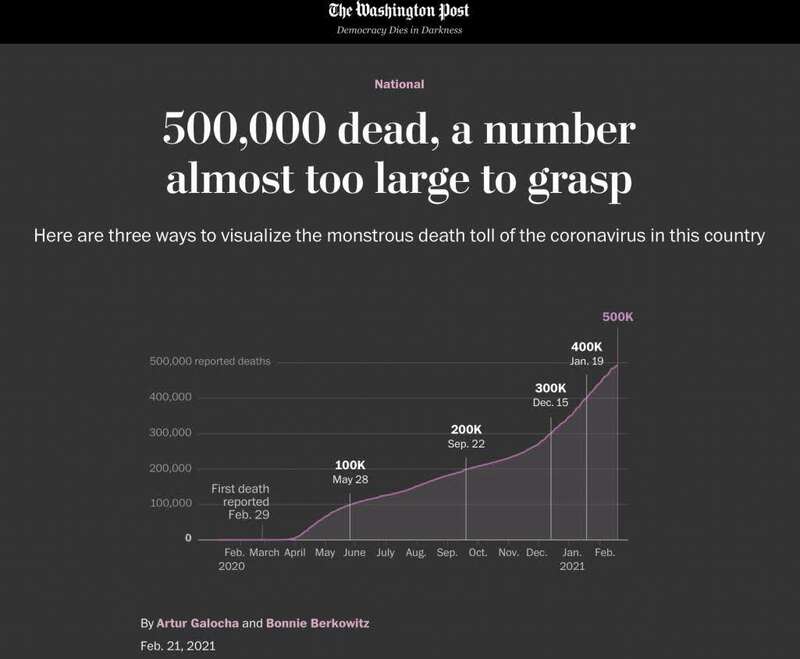 △《华盛顿邮报》网站用可视化的方式,展示了美国为防疫不力付出的惨重代价。