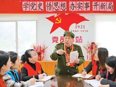 江苏省常州市钟楼区五星街道花园新村第一社区党委邀请94岁老党员夏文贵到党员驿站讲党课。