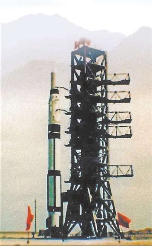 装载着“东方红一号”卫星的“长征一号”运载火箭竖立在甘肃酒泉卫星发射中心的发射塔架上。(资料照片)