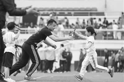 北京市崇文小学学生和家长共同进行“迎面接力”项目挑战。 本报记者 单艺伟 摄