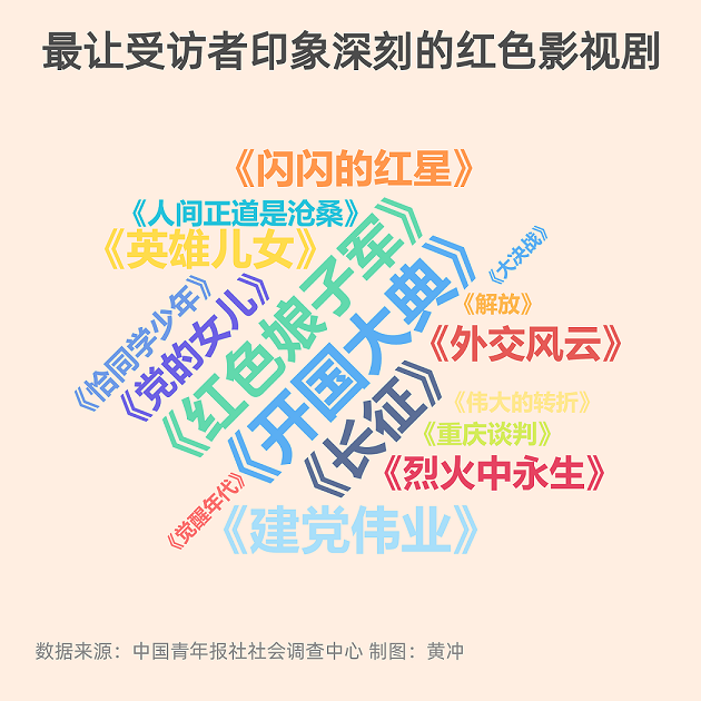 调查显示,最让受访者印象深刻的红色影视剧,排名前三的分别是《开国大典》(56.9%)、《红色娘子军》(49.0%)和《长征》(48.6%)。