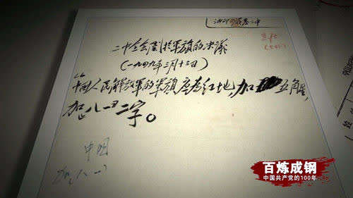 手稿上,毛泽东特别批示,在中国人民解放军军旗上加上“八一”二字。