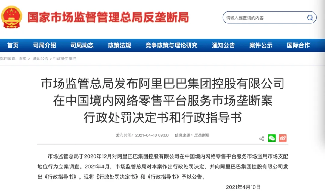 2021年4月10日(周六)上午,国家市场监督管理总局(以下简称“总局”)公布了对阿里巴巴集团控股有限公司(以下简称“阿里巴巴”)的行政处罚决定书,认定阿里巴巴自2015年以来实施的“二选一”行为构成了滥用市场支配地位行为,决定对其处以182.28亿元的罚款。[1]本案不仅是中国互联网领域认定垄断行为成立的第一案,创造了中国《反垄断法》实施十二余年来的处罚金额记录,也将肇始于去年11月的平台经济反垄断热潮推到了一个新的顶点。