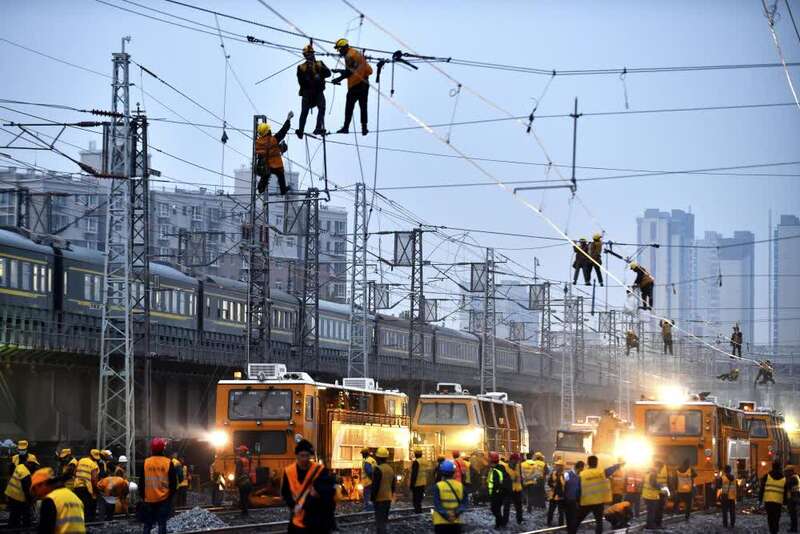 4月12日,在胶济铁路黄台站,中铁十局的工作人员在进行胶济铁路至济青高铁联络线黄台站改施工作业。新华社记者 郭绪雷 摄
