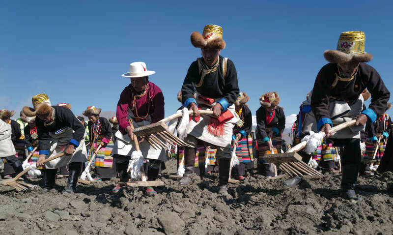 3月16日,西藏山南市乃东区克松社区居民参加春耕仪式。新华社记者 孙瑞博 摄