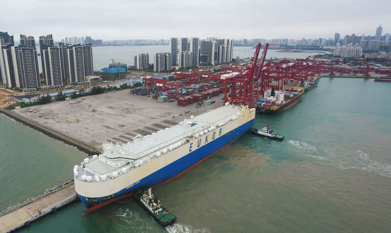 2020年2月16日,滚装货船“劳拉”轮驶入海口秀英港(无人机照片)。这是海南自贸区政策实施之后的首艘汽车外贸船。新华社记者 杨冠宇 摄