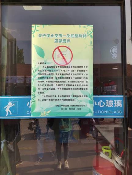 2021年寒假期间,河南大学总务处后勤集团总公司接到学校“限塑令”通知后,饮食服务中心立即开始制作宣传海报,并于1月30日分别在金明校区和明伦校区值班食堂出入口显著位置张贴。自2月1日起,河南大学寒假值班学生食堂开始停用一次性塑料袋,3月15日起在全校学生食堂全面实行。
