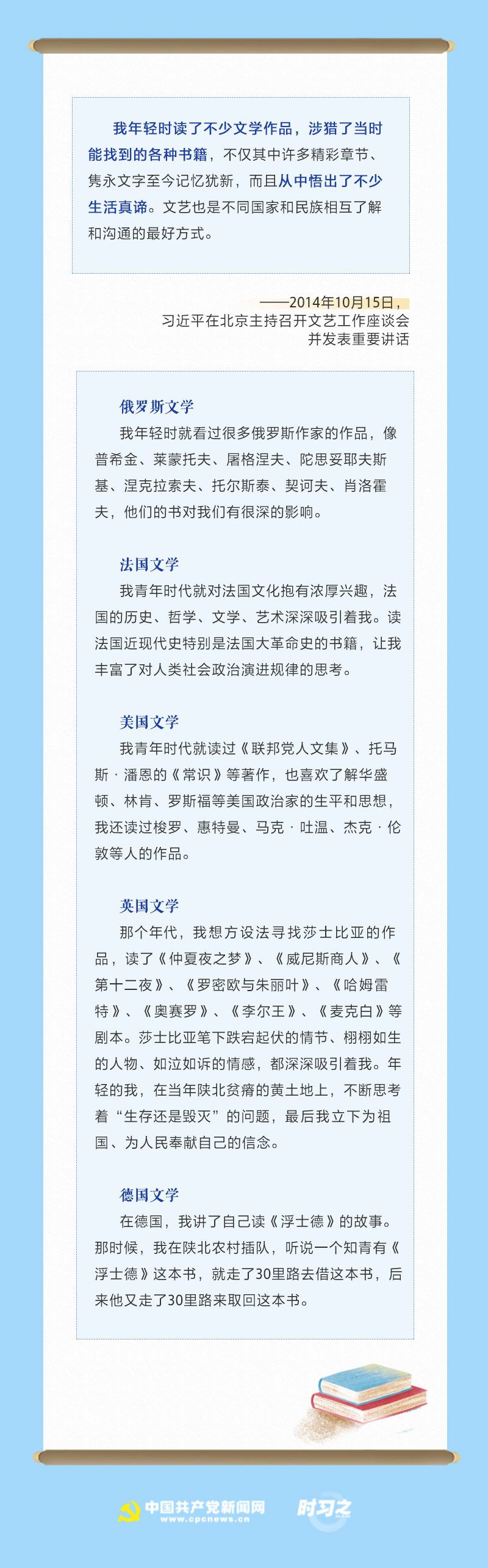 习近平经常引用《论语》《史记》《春秋》《汉书》《战国策》等中华优秀传统文化经典,可见其对中国文学涉猎广泛,除此之外,习近平也阅读了大量外国文学经典。