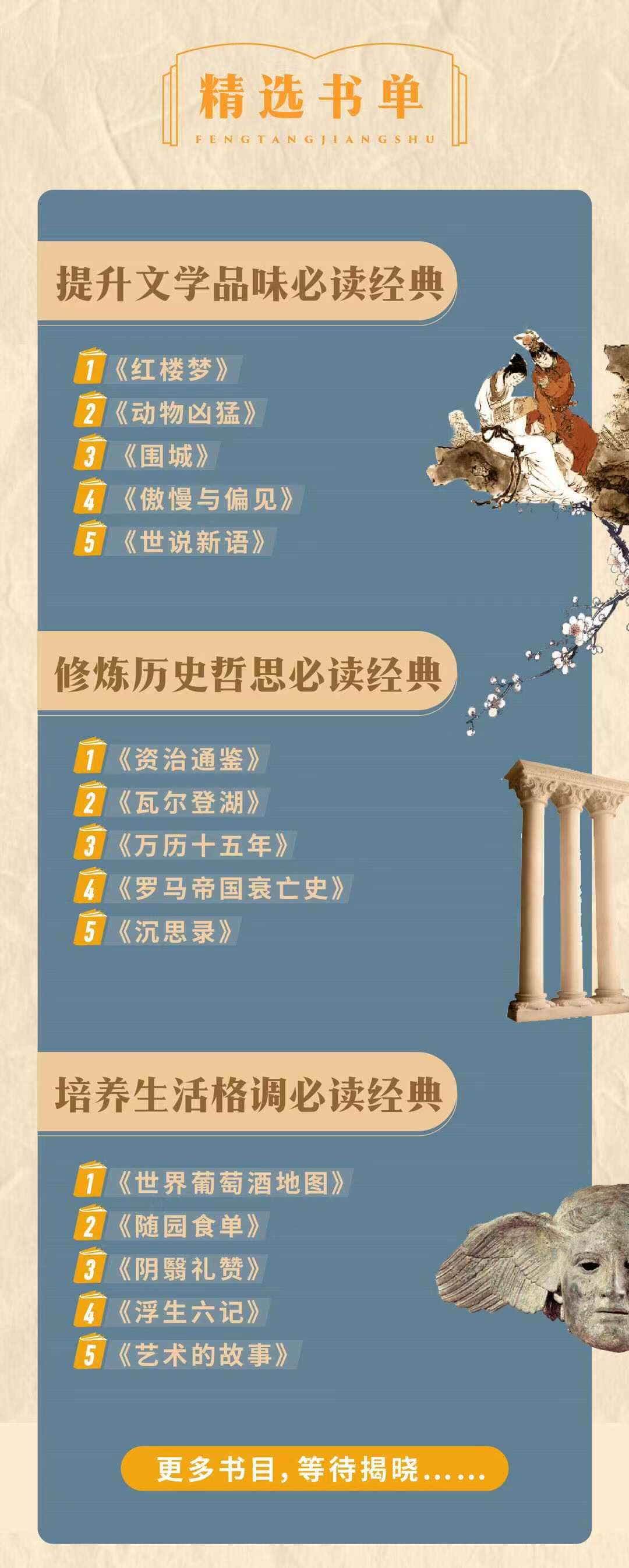 选书方向,来源于三个部分:文艺、管理(历史哲思)和生活。冯唐介绍:“管理是一生的日常,成事是一生的修行,你躲不开的。如果你想把今生过得好一点,管理是离不开的,无论你是做什么,甚至你不做什么,都离不开管理。第二是文艺,我觉得一个世界的美好是从文艺开始的。一个世界的不美好,也是从嘲笑文艺青年开始的。所以文艺一直是人根深蒂固的美好的一部分,我们不能忽略。哪怕你一门心思做生意,你也是做人的生意,做人的生意就要了解人,了解人最好的方式,就是要从文艺入手。第三,生活。生活里有很多美,我们不只是工作,哪怕像我过去20年,每周工作80~100个小时,我也是有生活的。我每天也要吃饭,每天也要喝茶,经常也要喝酒,而且我也有清风朗月。如何把生活过得更美好一点,也是我一直在想,一直在摸索,一直在做的一件事。清风朗月不用一钱买,生活美好并不意味着要花很多钱,并不意味着你要消耗很多精力。它本身可以是一种滋养,人生不过诗、酒、茶,诗、酒、茶不见得很贵。一册《唐诗三百首》是100块钱,如果你每天睡觉前都是背着唐诗入睡,看着唐诗入睡,很有可能你腹有诗书气自华,你变得更美好、更美丽,生活也变得更美好、更美丽,但是这是需要学习的。”