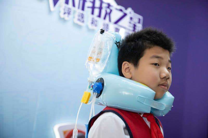 复旦大学第二附属学校吴增阳同学给大家介绍并演示了他的科技创新成果《颈枕式可移动智能输液架》。
