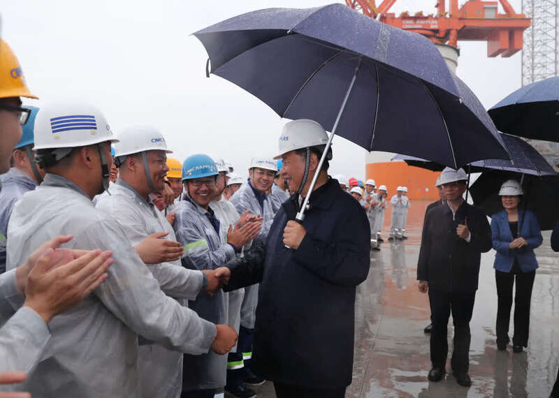 ↑2018年6月13日下午,习近平在山东中集来福士海洋工程有限公司烟台基地,冒雨察看海洋工程设备建设场地,并同现场的工人们亲切握手。