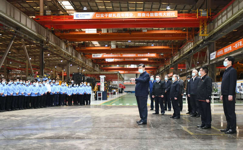 ↑2021年4月26日下午,习近平在广西柳工集团有限公司挖掘机装配厂,同企业职工和技术研发人员亲切交谈。