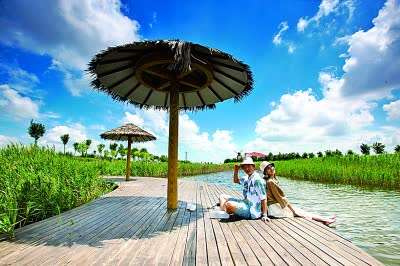 在黄骅市湿地公园内,一对情侣正在拍照 沈新生摄/光明图片