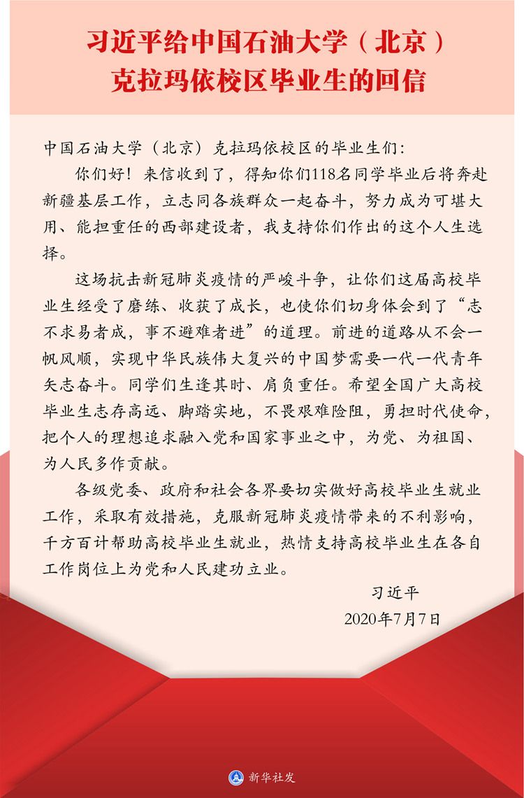 ——2020年7月7日,习近平总书记给中国石油大学(北京)克拉玛依校区毕业生的回信。中国石油大学(北京)克拉玛依校区2016年开始招生,435名首届毕业生来自全国16个省份,目前总体就业率接近85%,其中118人选择到新疆基层工作。这118名毕业生给习总书记写信,汇报了大学四年学习和思想上的收获,表达了扎根西部、建设边疆的坚强决心。