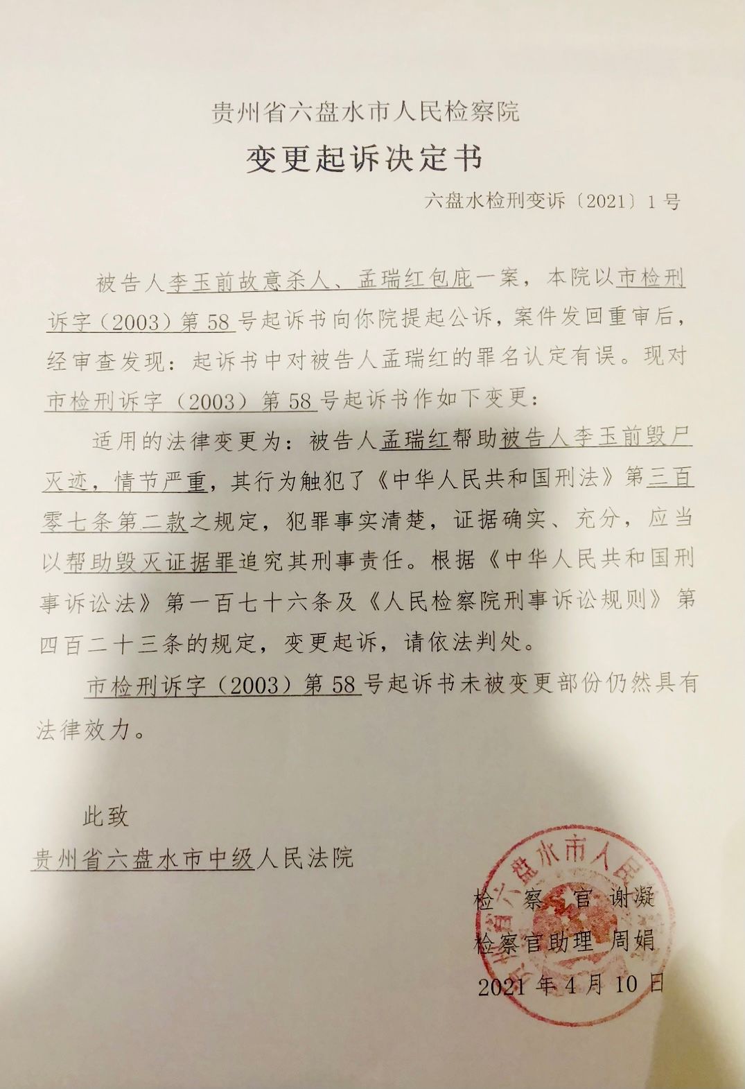 六盘水市检察院4月10日出具的变更起诉决定书显示,李玉前故意杀人、孟瑞红包庇一案发回重审后,经审查发现,原起诉书中对被告人孟瑞红的罪名认定有误。