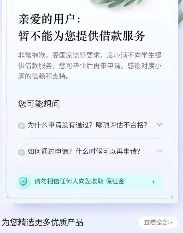其中有钱花工作人员向澎湃新闻称,按照国家规定,平台不为在校大学生提供贷款服务,包括教育贷款,“我们在用户申请贷款的时候,多个环节都明确提示了不为在校学生提供贷款,目前平台也在通过多种途径不断提升对在校学生的识别能力,规避在校学生获得贷款的可能性。”对于张墨为何能在2019年通过教育机构申请贷款?该工作人员称,或许当时规定不同,目前已经无法办理。