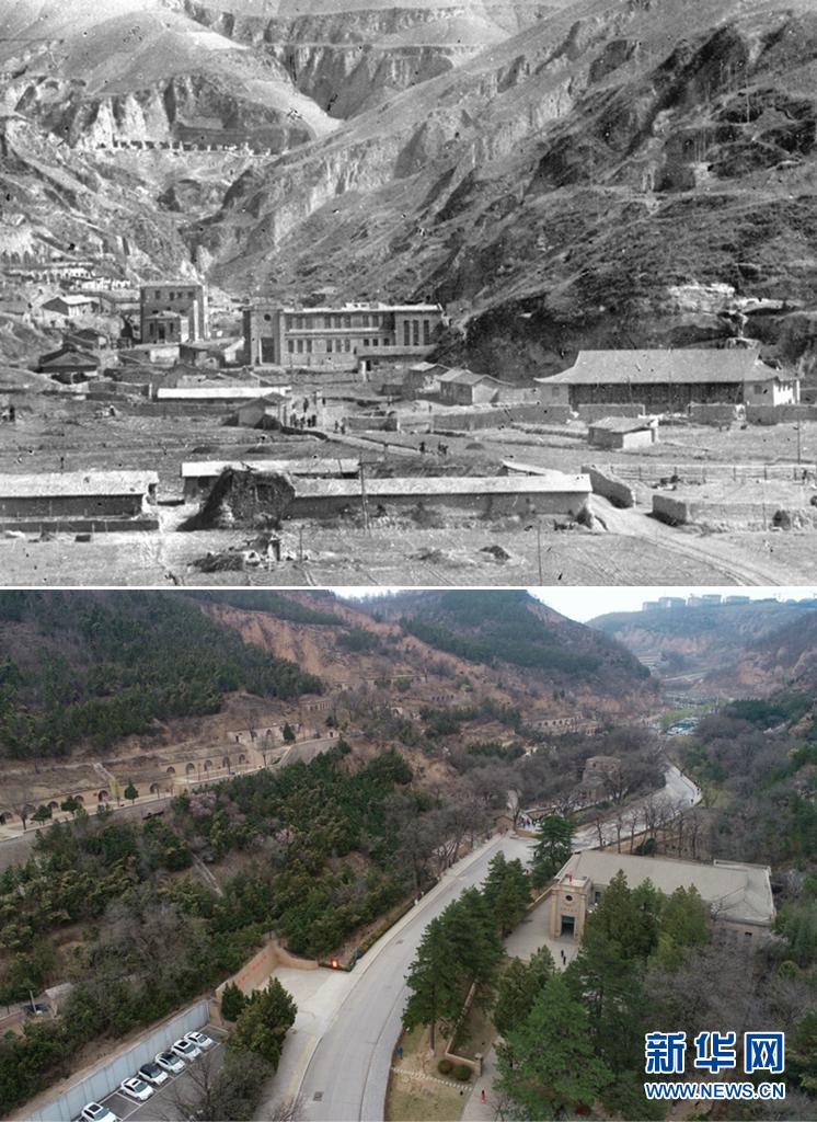 这是一张拼版照片,上图为:1943年拍摄的延安杨家岭——抗日战争时期党中央所在地(吴印咸摄);下图为:2021年4月21日拍摄的延安杨家岭革命旧址(无人机照片,新华社记者张博文摄)。新华社发