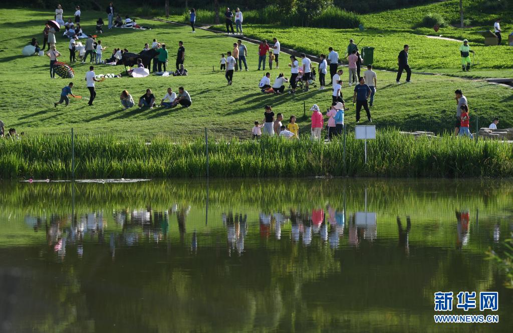 2020年8月19日,游人在位于延安市南泥湾景区的湿地公园游玩赏景。新华社发(祁小军 摄)