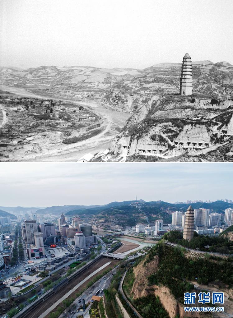 这是一张拼版照片,上图为:1938年拍摄的延安(资料照片,新华社发);下图为:2021年4月22日拍摄的延安市(无人机照片,新华社记者张博文摄 )新华社发
