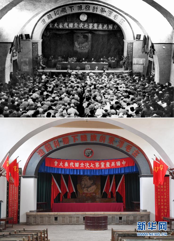 这是一张拼版照片,上图为:中国共产党“七大”会场(资料照片,新华社发);下图为:2021年3月31日拍摄的位于延安市杨家岭革命旧址的中国共产党“七大”会场(新华社记者张博文摄)。新华社发