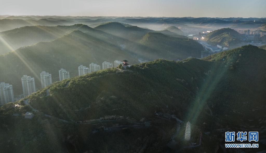 这是2019年8月29日拍摄的被绿色环绕的陕西省延安市宝塔山(无人机照片)。新华社记者 陶明 摄