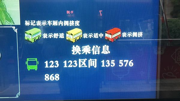 目前,站台显示分为两种,在71路等彩色显示屏上,所有运营的车辆用不同的颜色标识,其中,绿色代表舒适(尚有空位),黄色代表较舒适(少量站立),红色代表拥挤(站立空间较小)。