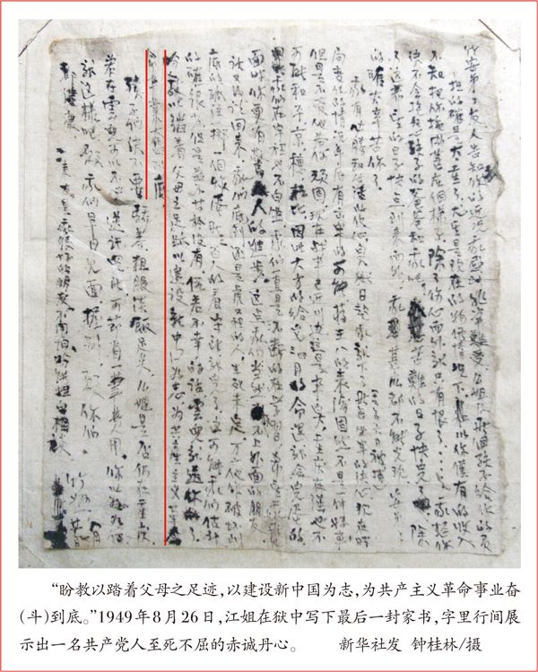 江姐本名江竹筠,1939年加入中国共产党。1948年6月14日,江竹筠被捕,被关押于重庆渣滓洞集中营。面对敌人的严刑拷打,始终坚贞不屈。“毒刑拷打,那是太小的考验。竹签子是竹子做的,共产党员的意志是钢铁。”她关心难友,参与领导狱中斗争,被亲切地称为“江姐”。1949年11月14日,在重庆解放前夕,江姐被国民党军统特务杀害,为共产主义理想献出29岁的生命。