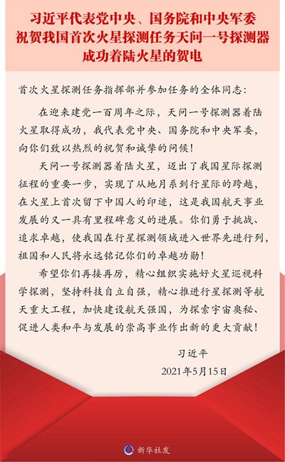 7时18分,天问一号探测器成功着陆于火星乌托邦平原南部预选着陆区,我国首次火星探测任务着陆火星取得成功。习近平总书记第一时间发来贺电,为首次火星探测任务指挥部并参加任务的全体同志点赞。