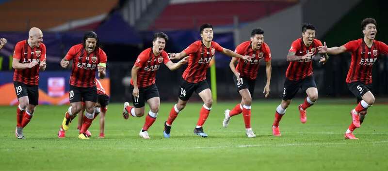 资料图:上海上港队球员在赛场上奔跑庆祝比赛胜利。新华社记者许畅摄