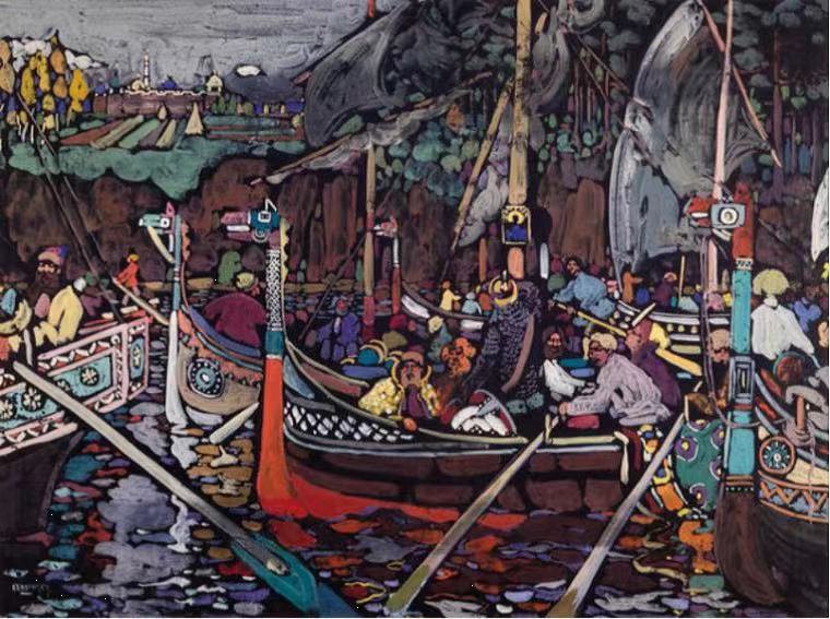 他在作品《歌》中,描绘了长船以及身着俄罗斯传统服饰的船夫,这充分显示了康定斯基对俄罗斯民间艺术的情感。这一点在名为《芭芭雅嘎》的小型雕版画中也有明显的体现,这幅版画描绘的是俄罗斯儿童熟知的一个反派人物。