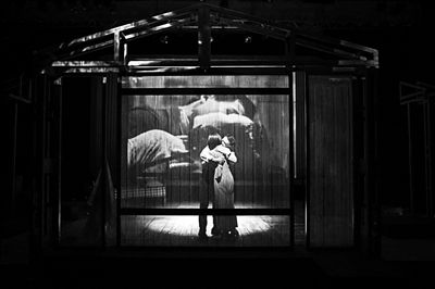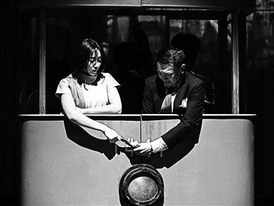 话剧《十字街头》试图将舞台空间整合为电影剪辑台,舞台镜头、影像镜头和表演镜头虚实结合,相互映衬,呈现出多元化的戏剧空间。电车上眉目传情的这一情节,电影的影像、演员的表演和现场实时拍摄实时投影,都被导演当作素材,并置于戏剧舞台上,这对于演员表演和舞台实时摄影都提出了挑战。