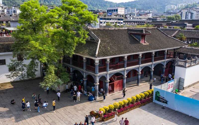 游客在遵义会议会址参观(5月3日摄,无人机照片)。新华社记者陶亮摄