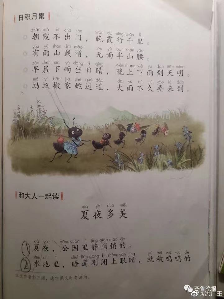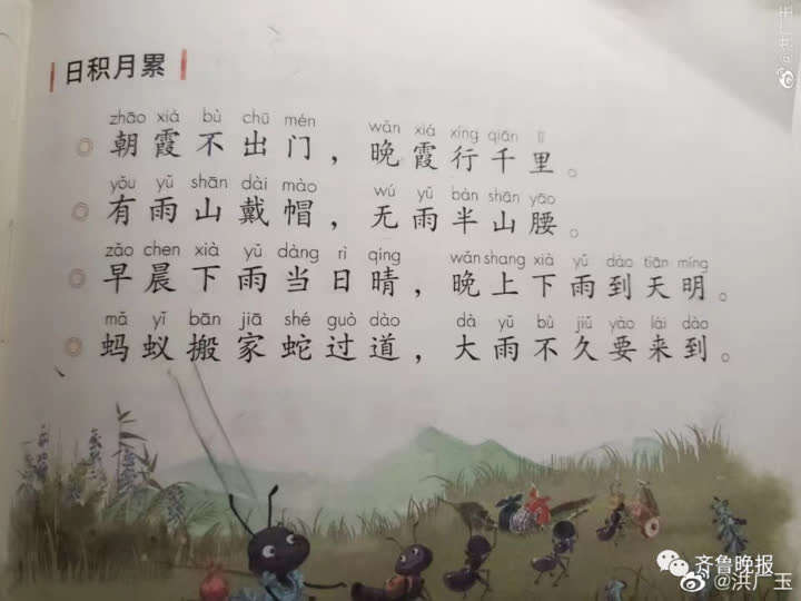 5月19日,家长洪广玉发微博称:“今天看孩子语文课本,发现有一处错误的知识——蚂蚁搬家跟下雨没关系,可能是种群扩大等原因,蚂蚁并没有测算雨下多大或淹到哪里的能力,如果蚂蚁有这个智商,那应该直接就把窝选在雨水淹不到的地方。”