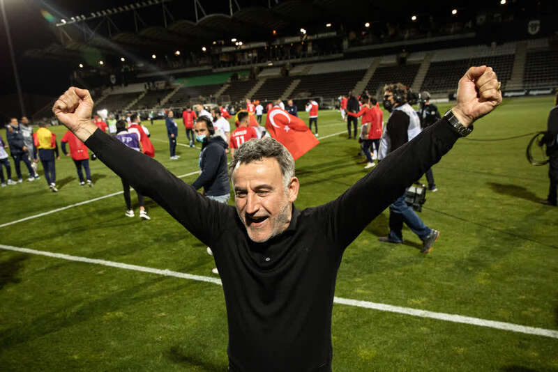 里尔队主教练加尔捷庆祝夺冠。新华社发(奥雷利安·莫里萨尔摄)