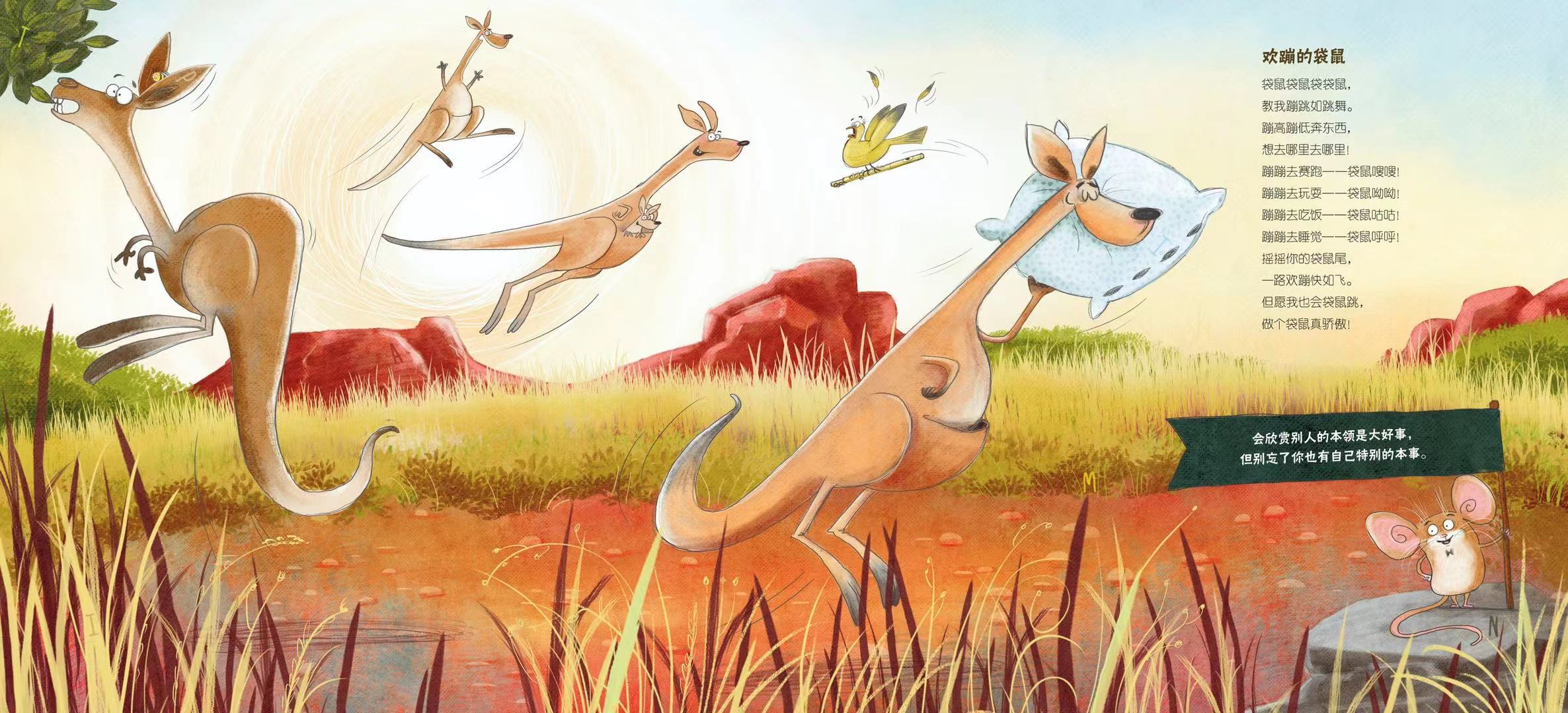 阿甲也谈了这本童书的翻译:“可能有人觉得童书这样的东西很容易翻译,但其实挺难的。它是童谣,是两两押韵的。童谣体跟成年人的诗歌不太一样,成年人诗歌往往是五音抑扬,童谣则大多是八个音节,两两对应。你想保持每一句都押韵不太容易,同时又因为是给小孩子听的,又不能用太难的词,比如这首叫做《忙碌的甲虫》,甲虫挖东西的时候是用腿,但是腿这个词押不上韵。我是这么翻译的——忙忙碌碌的甲壳虫,用小脚挖土咚里个咚。实在不能押韵的时候用拟声的词押韵一下。”