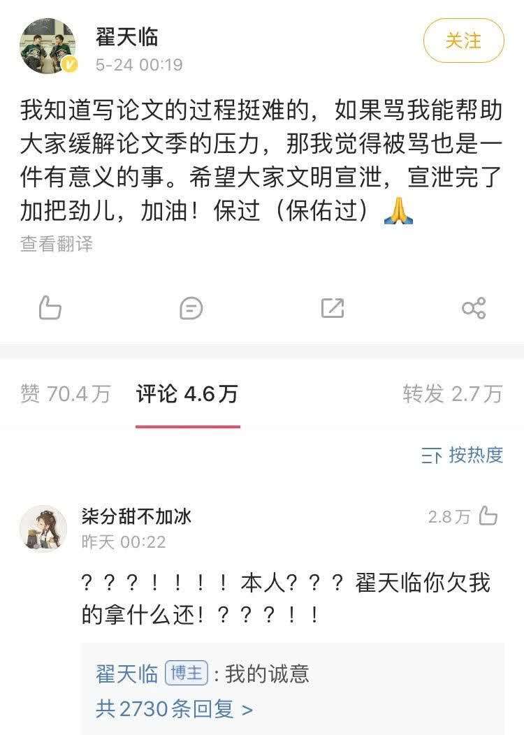 24日凌晨,演员翟天临通过个人实名认证微博发文:“我知道写论文的过程挺难的,如果骂我能帮助大家缓解论文季的压力,那我觉得被骂也是一件有意义的事。希望大家文明宣泄,宣泄完了加把劲儿,加油!保过(保佑过)”。