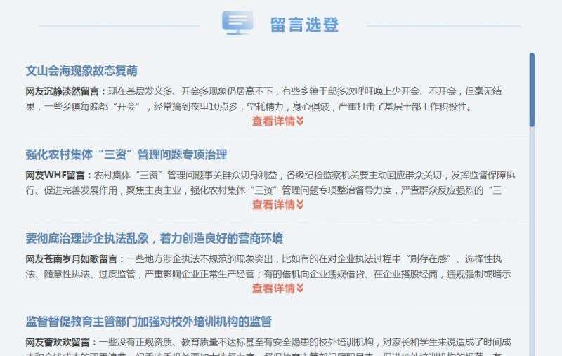 网友“WHF”在留言中表示,农村集体“三资”(资金、资产和资源)管理问题事关群众切身利益,各级纪检监察机关要主动回应群众关切,发挥监督保障执行、促进完善发展作用,聚焦主责主业,强化农村集体“三资”管理问题专项整治督导力度,严查群众反映强烈的“三资”管理问题,推动构建农村集体“三资”监管体系,打通农村基层监督“最后一公里”,推进农村基层治理体系和治理能力现代化。