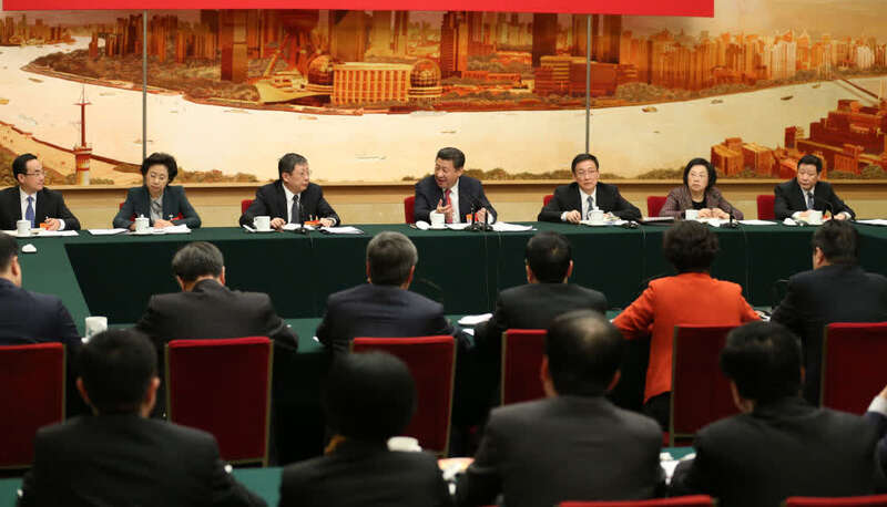 ↑2015年3月5日,习近平参加十二届全国人大三次会议上海代表团的审议。