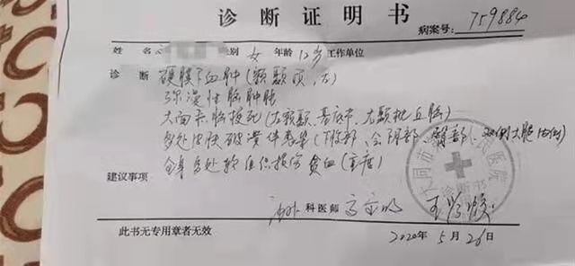 大同市第三人民医院于2020年5月26日出具的诊断证明书显示,朵朵头部硬膜下血肿,弥漫性脑肿胀,存在大面积脑梗死。同时,身上会阴部、臀部、双侧大腿内侧有多处皮肤破溃并伴有感染,全身多处软组织损伤贫血。