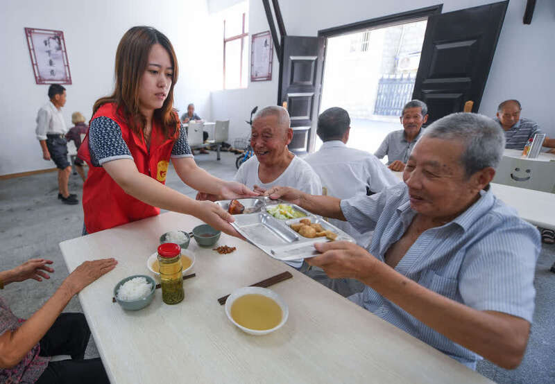 2020年8月12日,在浙江省杭州市富阳区东洲街道鸡笼山村居家养老中心的老年食堂内,青年党员志愿者为高龄老人送餐。