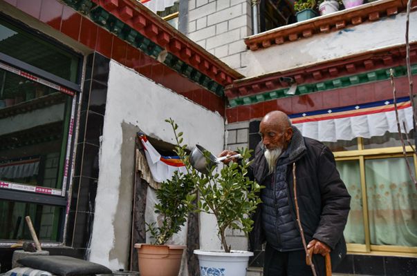 次多杰老人在给家里的花浇水(4月25日摄)。
