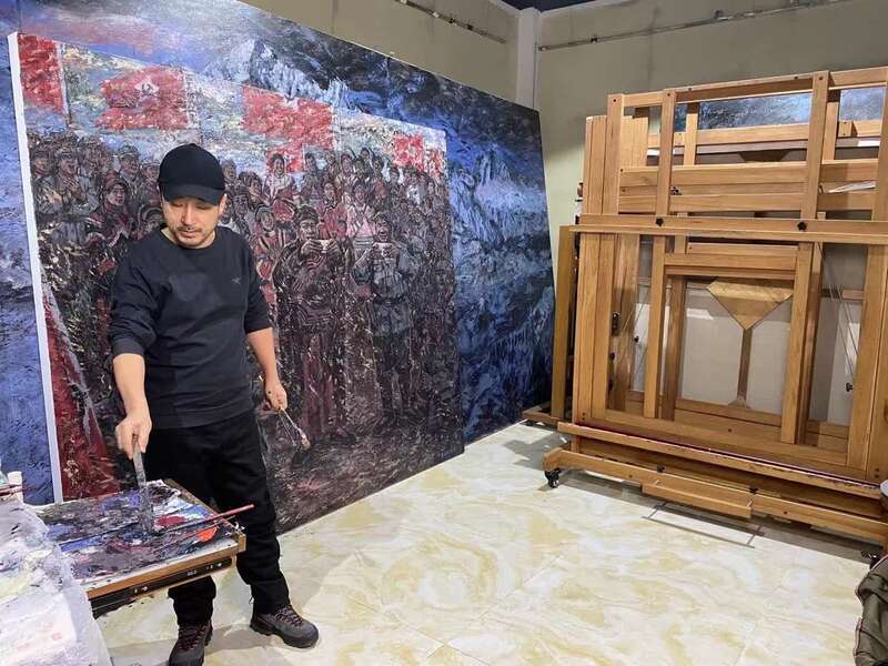 崔晓晓的长征路写生创作历时两年半,2018年~2020年分三次出发走完全程。“从瑞金到延安,我用脚步去丈量红色历史留下的痕迹,收集点点滴滴的视觉元素,在身临其境中找寻表现长征的情感源头和造型基础,力求在审美创造中感悟长征精髓、传递长征精神。”