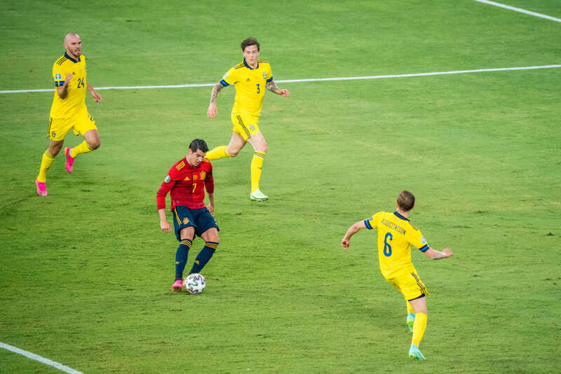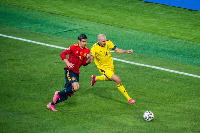 6月14日,西班牙队球员莫拉塔(左)与瑞典队球员丹尼尔森拼抢。新华社发(胡安·戈萨摄)