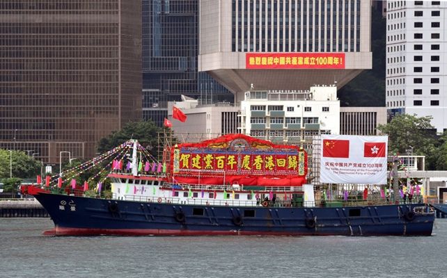 ▲7月1日,悬挂中华人民共和国国旗和香港特别行政区区旗的渔船在维多利亚港巡游。