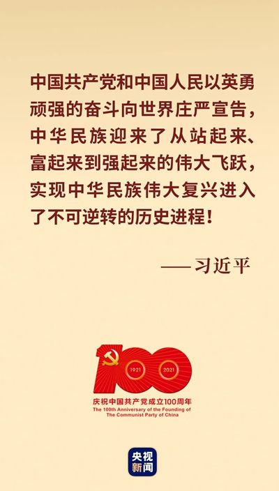 “一百年来,中国共产党团结带领中国人民进行的一切奋斗、一切牺牲、一切创造,归结起来就是一个主题:实现中华民族伟大复兴。”2021年7月1日,在庆祝中国共产党成立100周年大会上,习近平总书记的话语掷地有声。