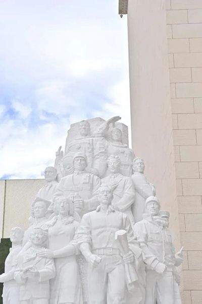 在中国共产党历史展览馆广场上,《信仰》《伟业》《攻坚》《追梦》四组大型雕塑巍然矗立,气势恢宏,分别对应“四个伟大”主题,276个人物与583块汉白玉融为一体。