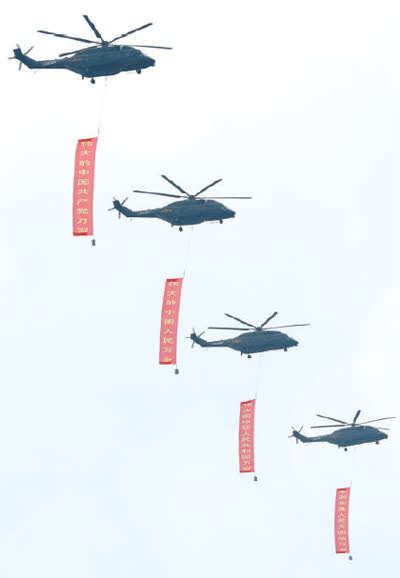 表演伊始,由7架直升机组成的空中护旗梯队悬挂党旗和四面巨幅标语,率先通过天安门广场上空。四幅标语上分别写着“伟大的中国共产党万岁”“伟大的中国人民万岁”“伟大的中华人民共和国万岁”“全国各族人民大团结万岁”。