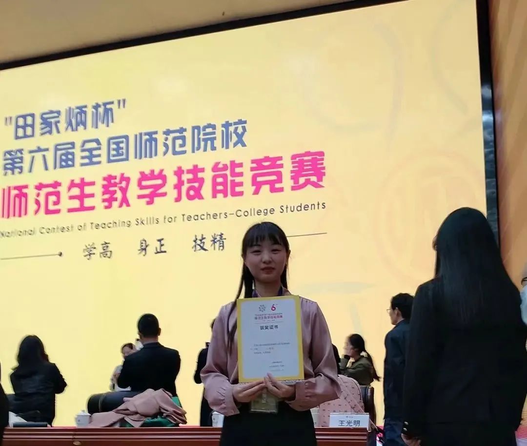 “我深深记得习总书记说‘走得再远,走到再光辉的未来,也不能忘记走过的过去,不能忘记为什么出发。’”正是这样的信念,使得她精益求精,更加优秀。2020年,黄欢欢获入学以来最高奖项——第六届全国师范院校师范生教学技能竞赛汉语言文学组一等奖,艰辛备赛的过程,成了她最深刻的回忆。
