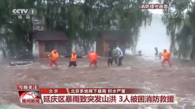 昨天(7月17日)夜间,北京延庆区普降大雨,局地暴雨,多地最大降雨量超过100毫米,大雨致多地被淹,其中延庆区珍珠泉乡水泉子村附近山洪爆发,河流水位暴涨。河对岸的一个停车场被水淹没,有3名男子凌晨外出时被困,抱着大树等待救援。清晨5时左右,消防救援人员接警后迅速赶往现场。由于当时降雨仍未停止,河流水位不断上涨,水流湍急。救援人员在固定好导向绳后,乘坐橡皮艇到达河对岸,随后再利用导向绳靠近被困人员。经过4个小时的努力,3人被转移至安全地点。