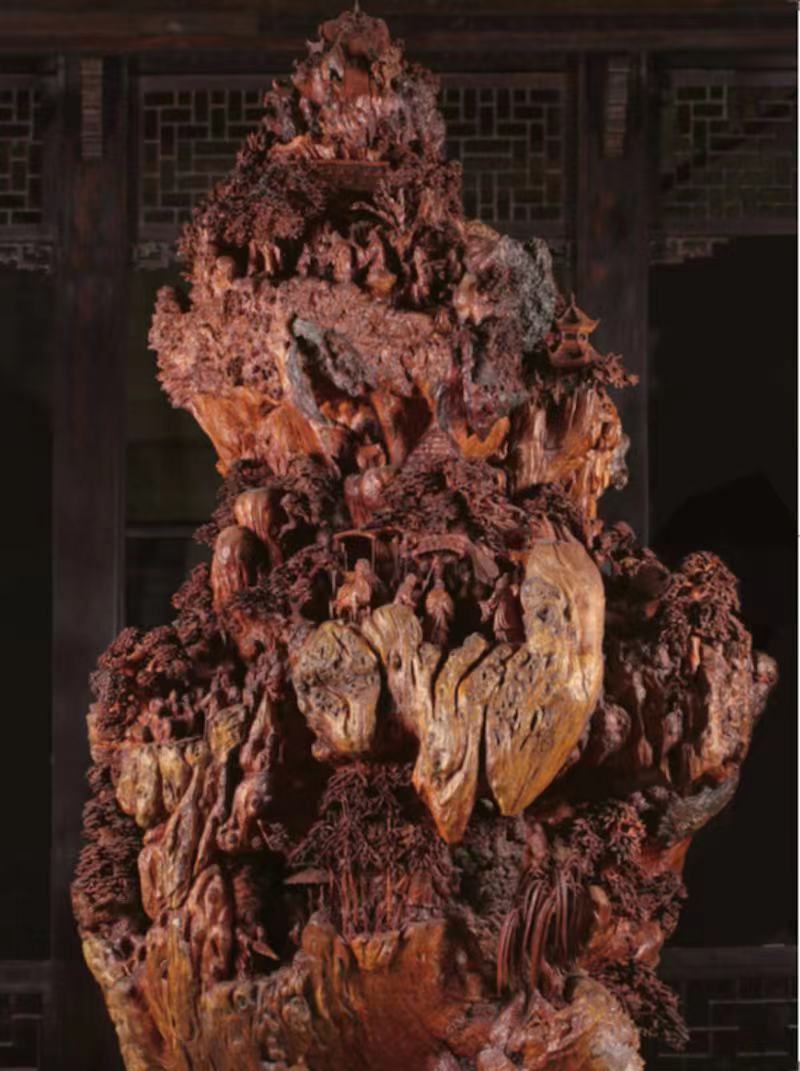 如大叶紫檀罩瘿木根雕《万世师表》,这件大型根雕作品以山峰为造型,是一部颂咏讴歌孔子博学多才、终成万世师表的璀璨史章。作品以整块瘿木雕刻而成,在山石的刻画中拉开了故事的序幕,在密林深穴中依次铺列了“入平仲学、太庙问礼、学琴师襄、问礼老聃”等20多篇历史典章。作品选用了重达数吨的整块瘿木制成,凝聚了10多位工艺大师、能工巧匠长达4年的心血。又如前不久完成的巨型木雕《祖国万岁》呈现的天安门、中华艺术宫、东方明珠等地标建筑。